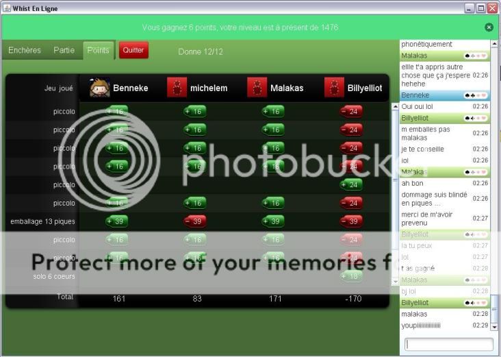 En fait à la partie d’avant, il a tenté 3 piccolos et 1 GM (il a juste réussi 1 piccolo). Je me suis dit « ca arrive, il a sans doute eu des cartes pas faciles et a essayé de s’en sortir comme il pouvait… » On a donc joué une deuxième partie qu’il commence par 2 piccolos (ratés) et là, j’ai eu le malheur de lui signaler très poliment qu’il n’était pas tout seul à la table. Sa réaction a été de nous signaler que si c’était ainsi, il ne ferait plus que des piccolos. Bon, il a fait une petite exception pour emballer michelem à 13 car il avait eu l’audace de le traiter de con, pour un solo et offrir la partie à Malakas qui était le seul à ne pas se plaindre réellement de la situation…